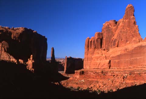The park lies atop an underground salt bed that is basically responsible for the arches, spires, balanced rocks, sandstone fins, and eroded monoliths that make the area a sightseer's mecca. Thousands of feet thick in places, this salt bed was deposited across the Colorado Plateau some 300 million years ago when a sea flowed into the region and eventually evaporated. Over millions of years, the salt bed was covered with residue from floods, winds, and the oceans that came and went. Much of the debris was compressed into rock. At one time this overlying layer of rock may have been more than a mile thick.