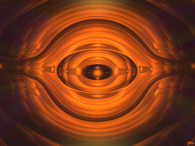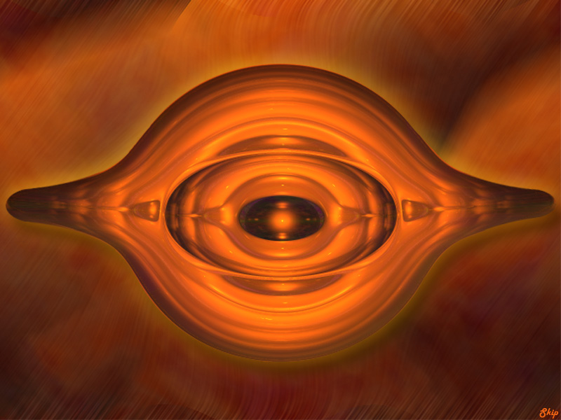 | The scene was built and rendered in Bryce. It consists of only two glass textured torus' (one looking into the next, two lights, and a sphere at the end, an alien type atmosphere provides the rest. Click here to see the original, untouched render from Bryce. Then imported into Photoshop to cut out the center piece of the scene, add color saturation and create the background. Download a High Resolution Version (800 x 600) | |