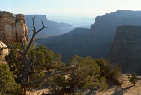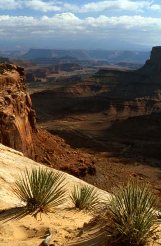 Views from Island in the Sky reach from the depths of the Green and Colorado rivers to the heights of distant mountaintops and above. They stretch across canyon after canyon to the horizon 100 miles distant. A broad, level mesa wedged between the Green and Colorado, Island in the Sky serves as Canyonlands' observation tower. From its many overlooks sightseers absorb over-whelming vistas of almost incomprehensible dimensions. Closest to the mesa's edge is the White Rim, a nearly continuous sandstone bench 1,200 feet below the Island. Another 1,000 feet beneath the White Rim are the rivers, shadowed by sheer canyon cliffs, and beyond them lie The Maze and The Needles.